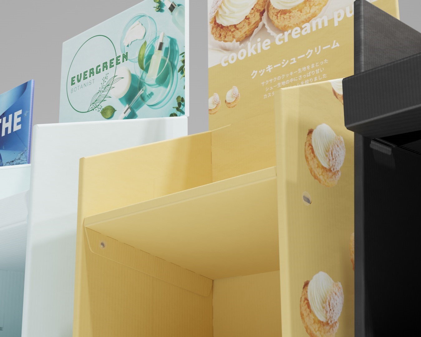 フロア什器・カウンター什器・ハンガー什器等お客様の目を引く販促物を制作可能です。紙器設計士・デザイナーが常駐しているのでワンストップでの制作進行が可能です。